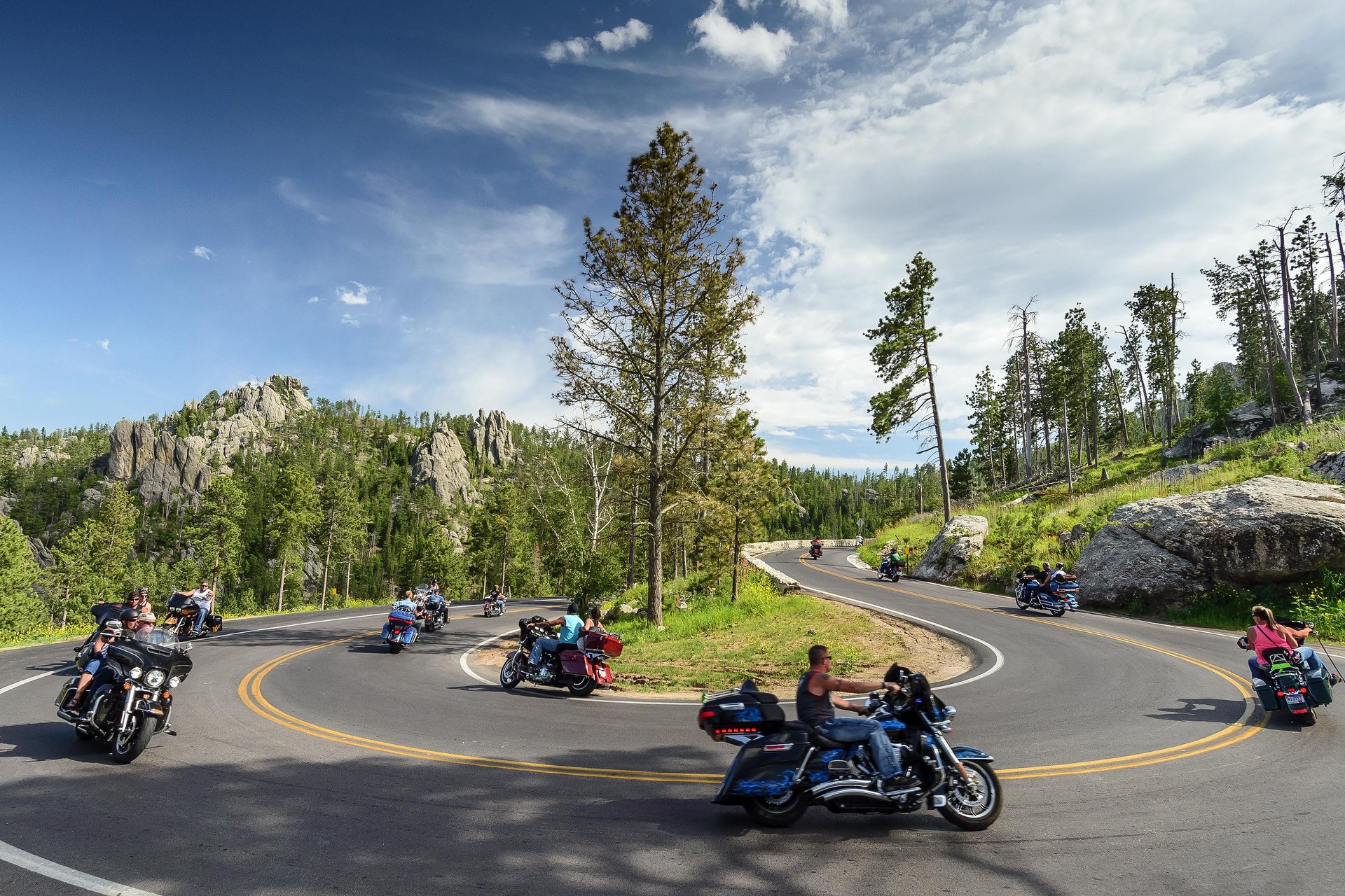 Sturgis ligger precis vid foten av Black Hills, och det är här de riktiga hojturerna börjar. Landskapet är kuperat, med täta skogar, granitklippor, slingriga vägar och utsikter som känns nästan surrealistiska.